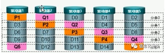 5、Raid6是Raid5的升级版:将数据分别写入不同的磁盘,校验磁盘不再单独存在,而是由数据磁盘分别承担,同时有两个校验码(P、Q),磁盘利用率较高。缺点是:是同时只能坏两块磁盘,同时三个以上磁盘坏则无法数据找回。主要应用场景:对数据的读取、写入性能要求高,同时要求一定的可靠性,真实项目中用得非常多,甚至是默认的磁盘阵列出厂RAID配置。四块硬盘即可支持配置。