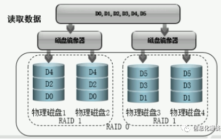 6、Raid10是Raid0和RAID1的结合体:Raid10不能读作Raid拾,而应读作Raid 壹零。数据写入时,首先执行Raid1操作,将数据复制成两份存;然后再执行Raid0,将数据串行写入不同磁盘。优点是性能好、可靠性高。缺点是:磁盘利用率不高。主要应用场景:金融、电信级的企业,对性能、可靠性都要求非常高,成本相对富余。四块硬盘即可支持配置。
