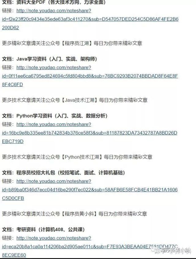 以上资料都将会整理到《程序员黄小斜2019学习资料》中,只需关注微信公众号【程序员黄小斜】后回复【2019】即可领取所有资料,没有其他套路,应该算是比较良心了。