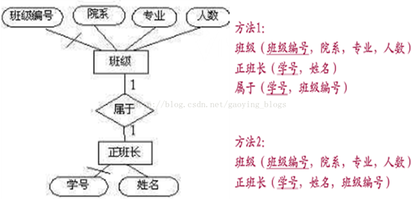 在这个例子中,利用方法一,先将两个实体正班长和班级的属性照着写下来,然后将关系模式“属于”的属性写出来——即两边实体的主码,其中关系模型“属于”的主键可以是两端实体集的任一主码。利用方法二,也是先将两端实体的属性照着写下来,然后注意这一点,将一端实体的主码加到另一端实体的主码中,图例中就是将“班级”实体的主码加入到“正班长”关系属性中。