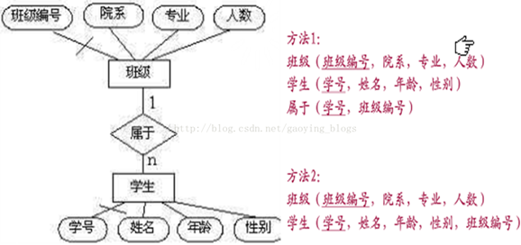 如图,在方法一中,关系模式的主键是n端学生实体的主键。在方法二中,将一端对应的实体主键“班级编号”加入到了对应n端“学生”的关系模式中,并且,n端的主码仍然为该关系模式的主码。