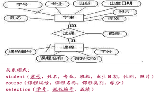 在上图这个例子中,每个实体集都对应一个关系模式,其联系“选课”也对应一个关系模式,这个关系模式的主码便是两端实体集的主码。关于E-R模型转化成关系模型我们就学到这里,其实很简单,只要掌握了要领,做几个例子,就会很好的上手,就会达到掌握的目的了。