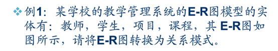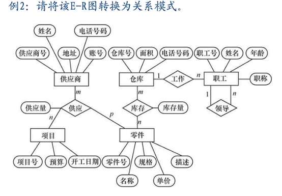 有两种方法解决这个问题。第一个方法:可以单独对应一个关系模式,由各实体的主码构成关系模式,而关系模式的主码可以是任一个实体集的主码。而实体中属性照常写就可以了。第二个方法:实体中的属性照常写,然后将一方实体集的主码加到另一方实体集对应的关系模式中。下面举个例子我们来看一下: