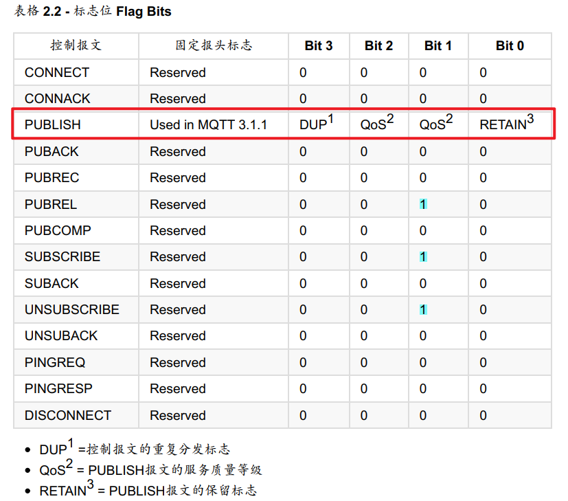 固定报头的 字节1 包括两部分:MQTT控制报文的类型和标志位。其中,报文类型就是上面的14种,标志位如下所示: