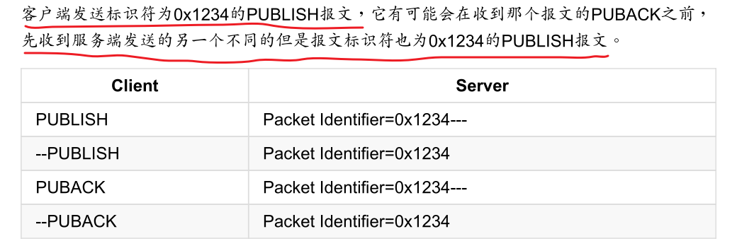 使用场景:保证送达,可能重复(因为有可能Client网络不好,没收到PUBACK报文,从而重复发布报文给服务器)。