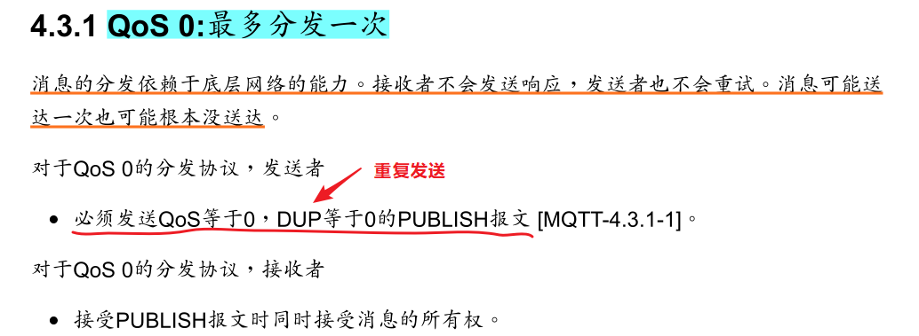 Client收到PUBACK后,删除Message;如果未收到PUBACK,设置DUP++,重新发送,Server端重新发布,所以有可能重复发送消息。