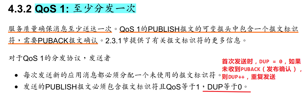 Client[Qos=1,DUP=0/*重复次数*/,MessageId=x]--->PUBLISH--> Server收到后,存储Message,发布,删除,向Client回发PUBACK。