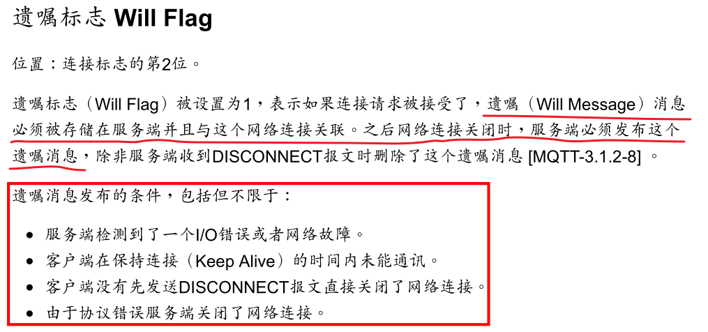 如果一个设备创建了遗嘱消息,当从MQTT服务端异常断开时,MQTT服务端会将这个设备的遗嘱消息分发给所有订阅了遗嘱主题的其他设备。