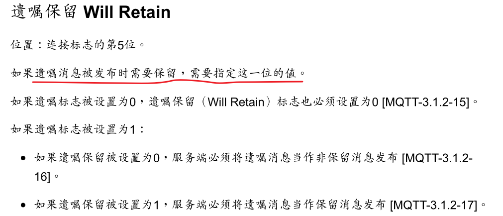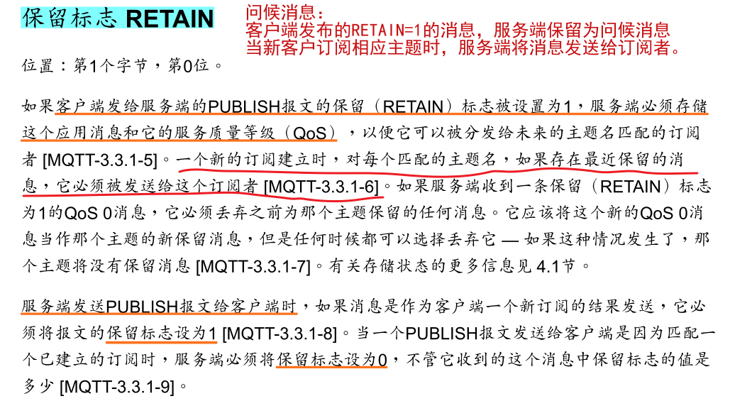 如果保留标志为1,服务器会保留这条消息。如果将来有新的订阅者,服务器会将这条消息分发给新的订阅者。比如,在微信公众号上写文章,这些文章都被微信的服务器保留下来,当我们去关注了这个公众号时,就能查看到之前所有的文章。