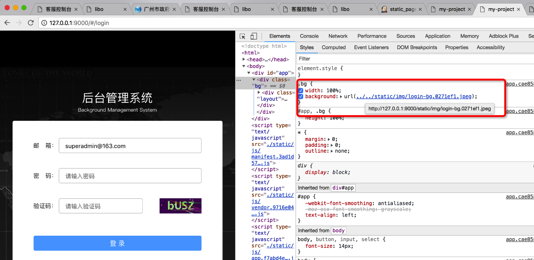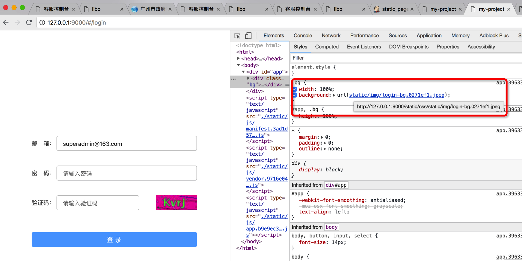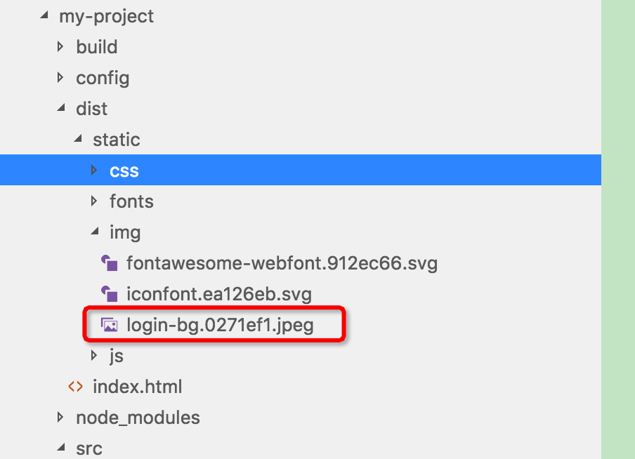 图二:使用npm run build命令打包之后,访问dist目录下的文件,出现的问题,背景图片路径变成了http://127.0.0.1:9000/static/css/static/img/login-bg.0271ef1.jpeg,而实际在dist目录下,图片路径是这样的,如下图