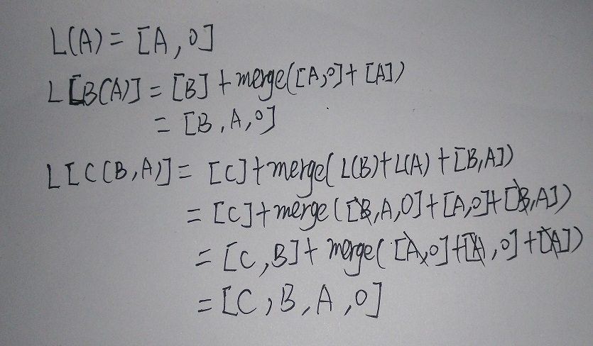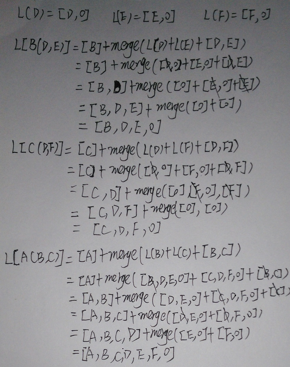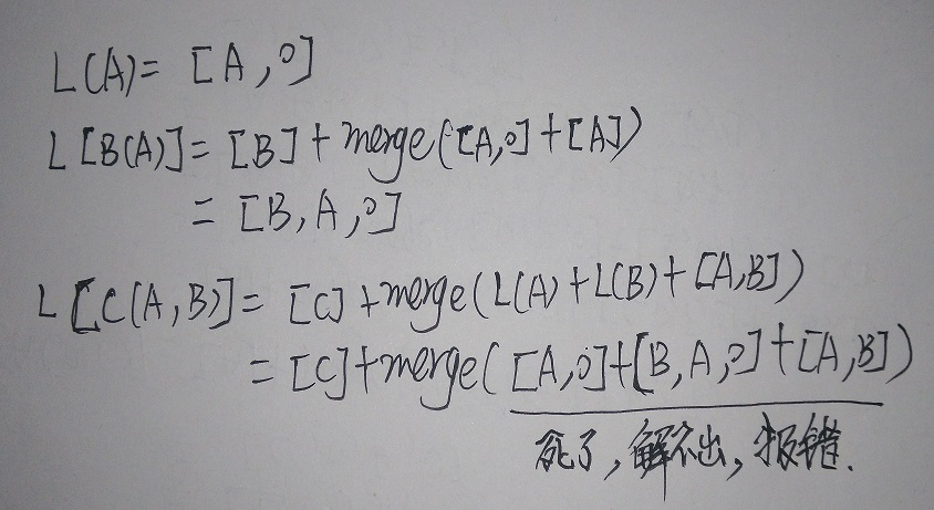L[object] = [object] L[C(B1,B2,...,B(N-1),BN)] = [C] + merge(L[B1]+L[B2]+...+L[B(N-1)]+L[BN], [B1,B2,...,B(N-1),BN]) #这种解法是正确的