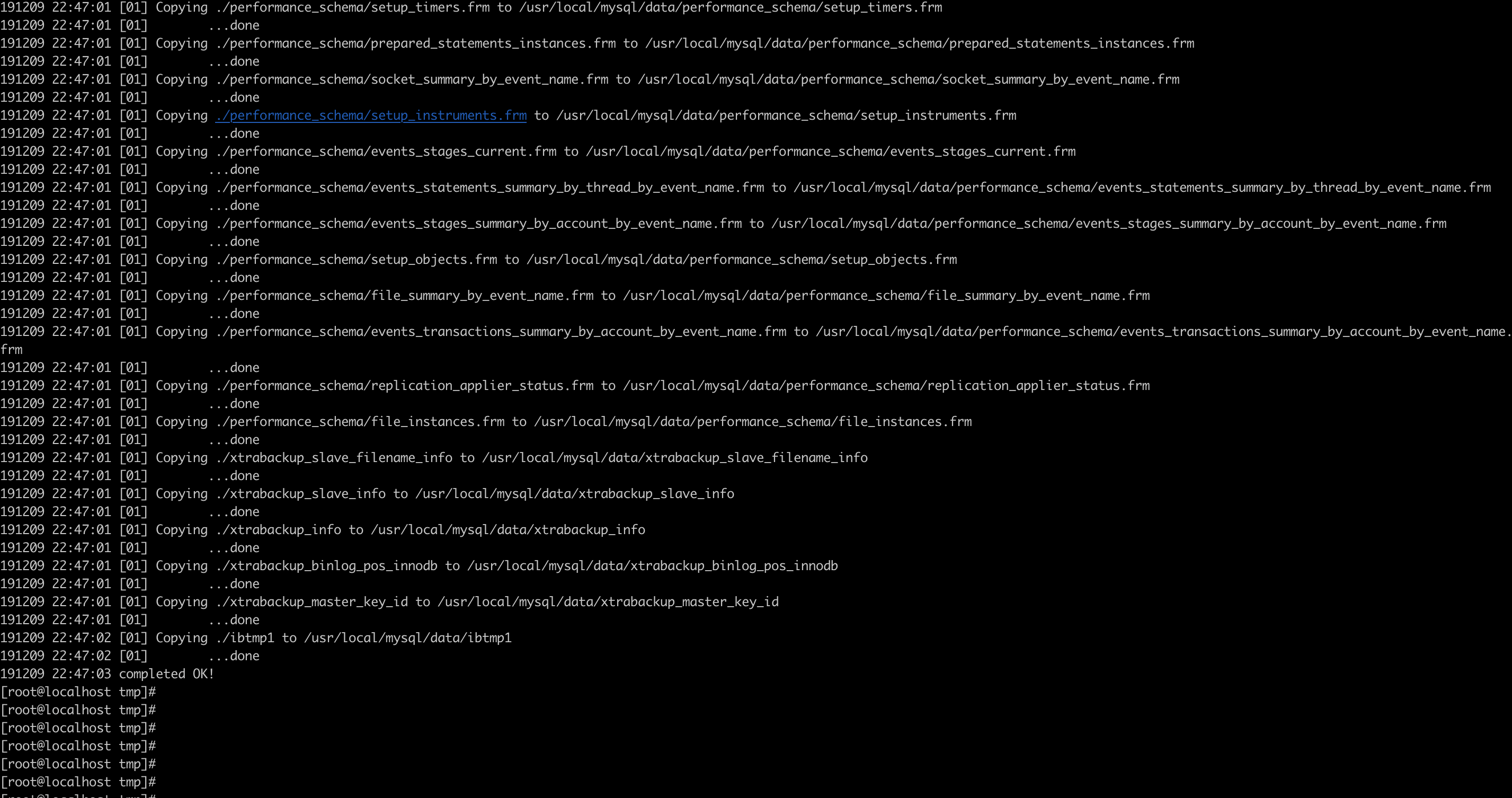 innobackupex --defaults-file=/etc/my.cnf --user=root --apply-log /home/bak/2019-12-09_03-41-59