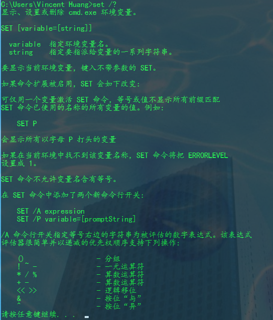 有关 set 命令的其他用法请参考 set 命令帮助:在命令行输入 set /? 回车即可查看 set 命令帮助