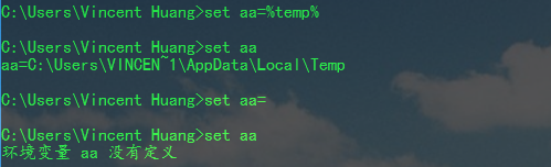 也可以自定义环境变量,例如我们输入 set aa=%temp% ,就代表把临时文件夹的值赋值给aa。我们还可以删除环境变量,例如我们输入 set aa= 就可以把我们刚才建立的环境变量删除了。