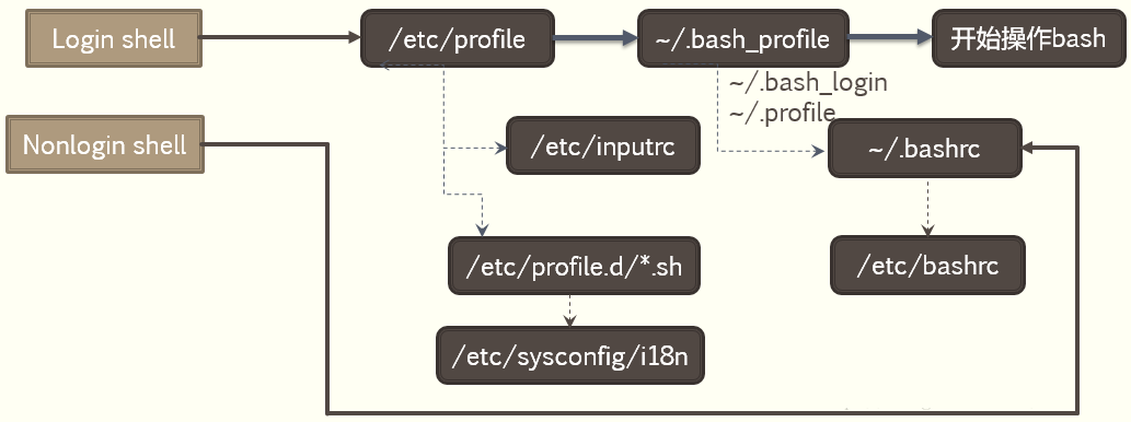 其中,实线的的方向是主线流程,虚线的方向则是被调用(或读取)的配置文件 ,执行完 bash 操作后退出 bash shell 时会执行~/.bash_logout 文件。