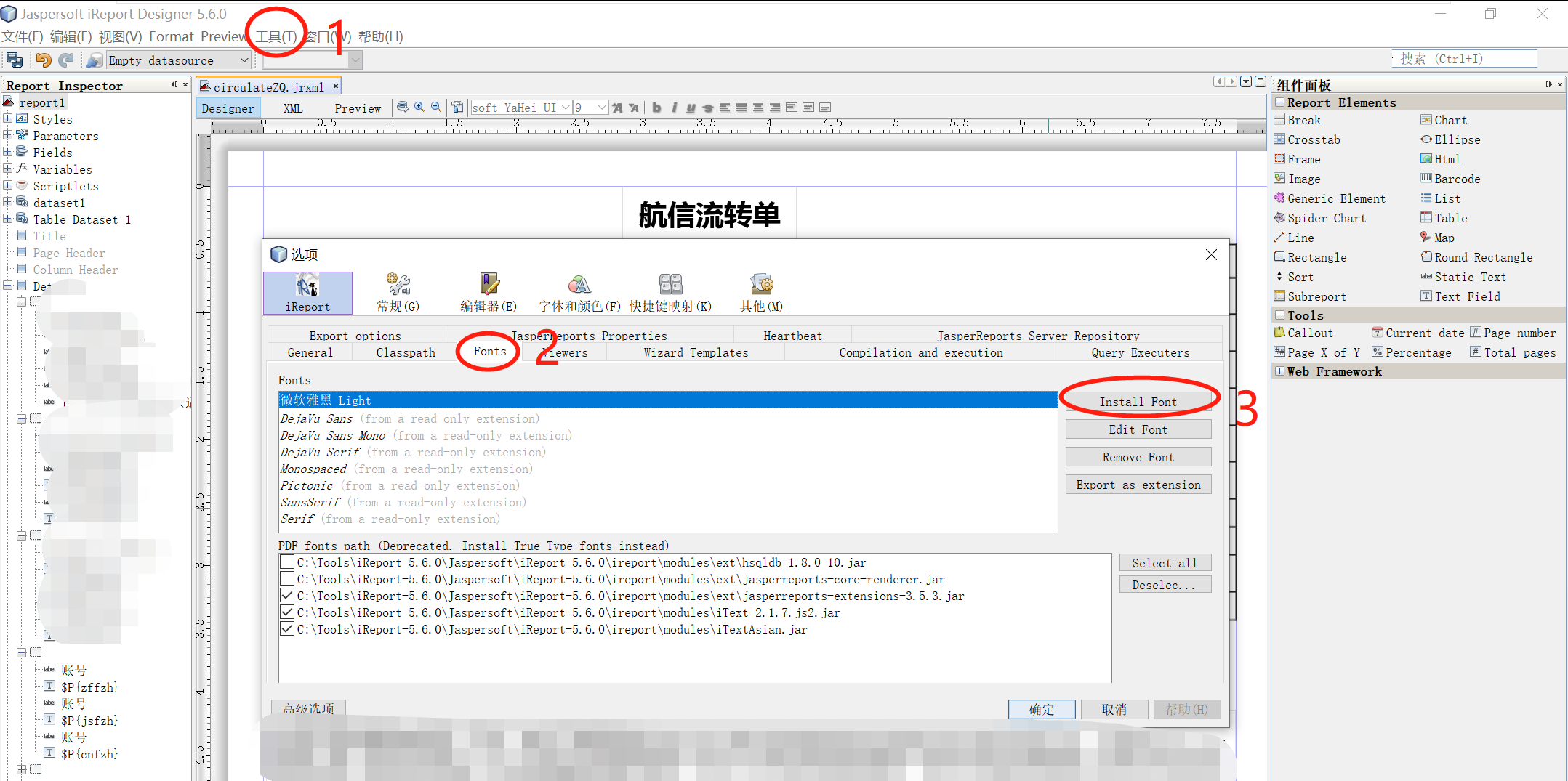 iReport是为jasperReports Library和JasperReports Server设计的报表可视化设计器,其遵循AGPL自由开源协议,在SourceForge.net开源社区发布,在国内的应用还是不少的。iReport Designer工具已经在14年停止维护了,最终版本是v5.6.0,其用于绘制单据结构还是非常的方便,通过拖拽就行,默认库中也有部分字体可以使用,基本能满足需求,所以首选的便是这个,网上一搜有不少帖子,基本应用通过这些帖子还是可以达到。