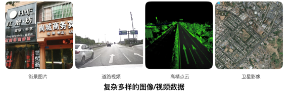 高德地图拥有图像/视频大数据,在众多业务场景上都需要理解图像中的内容。例如,在数据的自动化生产中,通常需要寻找文字、路面、房屋、桥梁、指示牌、路面标线等目标。这些数据里有些是通过采集车辆或卫星拍摄,也有些数据则是通过用户手机拍摄,如下图所示: