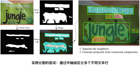 因此,我们提出了一个多任务网络来实现自己的实例分割框架。针对目标粘连的问题,我们在原始网络中追加了一个分割任务,其目标是分割出每个文本行的“中轴线”,然后通过中轴线区域来拆分粘连的文本行区域。拆分的方法则是一个类似于 Dijkstra 的算法求解每个文本区域像素到区域内中轴线的距离,并以最短距离的中轴线作为像素归属。
