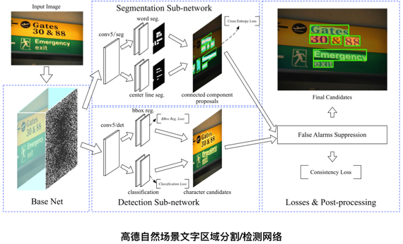 于 2014 年底问世的全卷积神经网络 [2](FCNs, Fully Convolutional Networks)无疑是继 2012 年问鼎 ImageNet 大赛以来深度学习发展的又一里程碑。FCNs 提供了第一个端到端式的深度学习图像分割解决方案。FCNs 在 CNN 的基础上可以从任意尺寸的输入进行逐像素的分类。我们也在第一时间将其落地到高德自身的应用场景中,例如文字区域的分割。自然场景下的文字由于其背景、光照复杂,文字朝向、字体多样,使得人工构建特征十分困难。