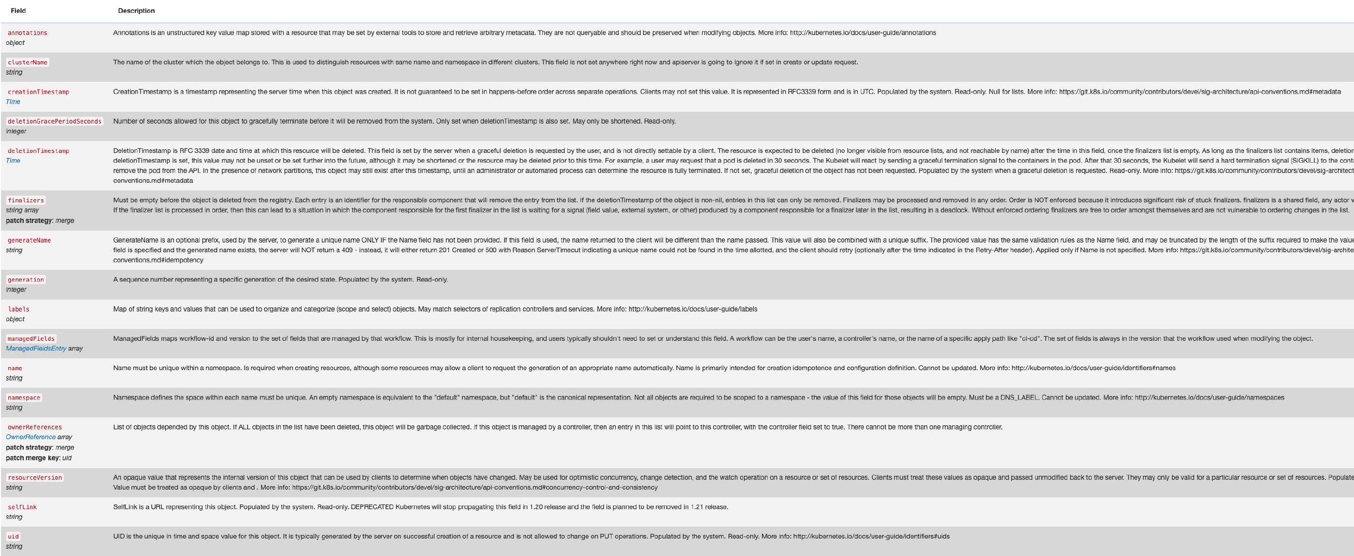 这里仍然假设需要创建一个Deployment,apiVersion和kind此时都已经确定了(如果仍然不明白,建议再看一下上面一节)。 然后开始写metedata. 通过ObjectMeta可以看到里面有很多属性,例如annotations表示一些注释信息,类型是obejct,通过后面的链接: https://kubernetes.io/docs/concepts/overview/working-with-objects/annotations/ 可以得知是一个key=value格式的map。 如果要添加注释信息,可以按照如下方式编写: