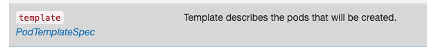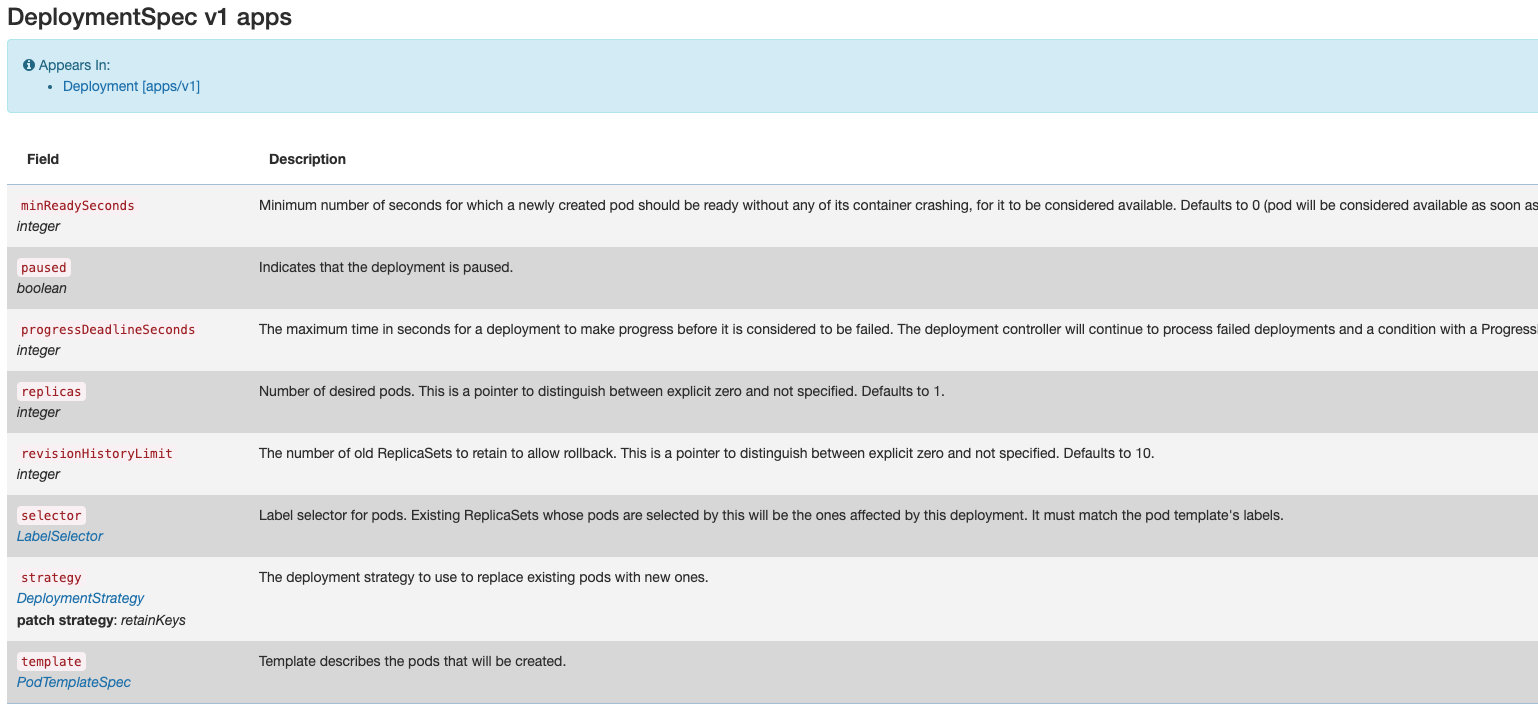 每个属性都有解释,这里就不逐一翻译了, 我们假设这个Deployment预期两个Pod,因此replicas=2,通过selector来匹配ReplicaSet,设定strategy为滚动更新。 在上面资源文件的基础之上,我们继续定义spec,如下: