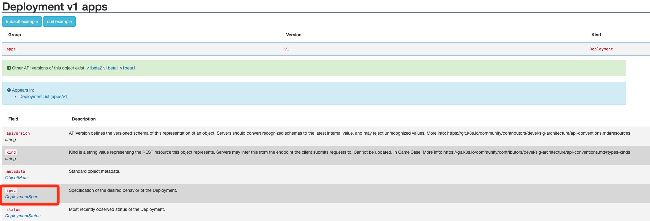 版本号由Group/Version这样的格式组成,因此Deployment的apiVersion就是apps/v1。 需要注意下面一行小字: "Other API versions of this object exist: v1beta2 v1beta1 v1beta1",因此apps/v1beta2, apps/v1beta1这样的版本号也是合法的。 具体使用哪个版本号,最终要取决于集群支持哪个版本号。