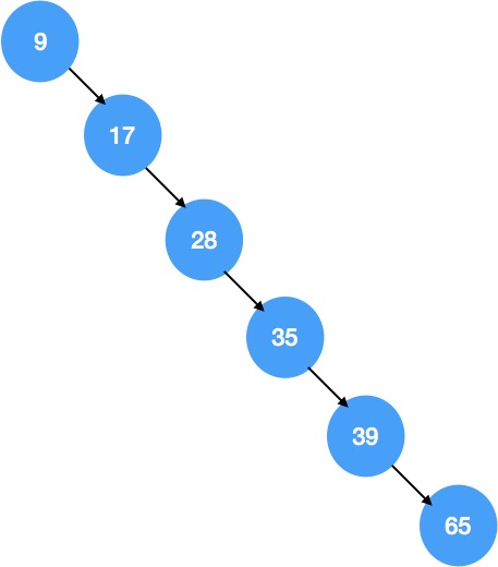 但是,当插入的一组元素正好是有序的时候,排序二叉树就变成了下边这样了,就变成了普通的链表结构,如下图所示:
