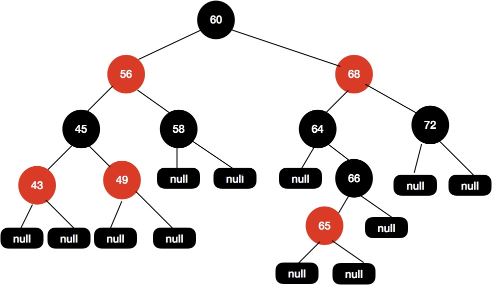 但是,同样的问题,上面这颗红黑树的黑色高度还是不一致,60-68-64-null 和 60-68-64-66-null 这两条路径黑色高度还是不一致。