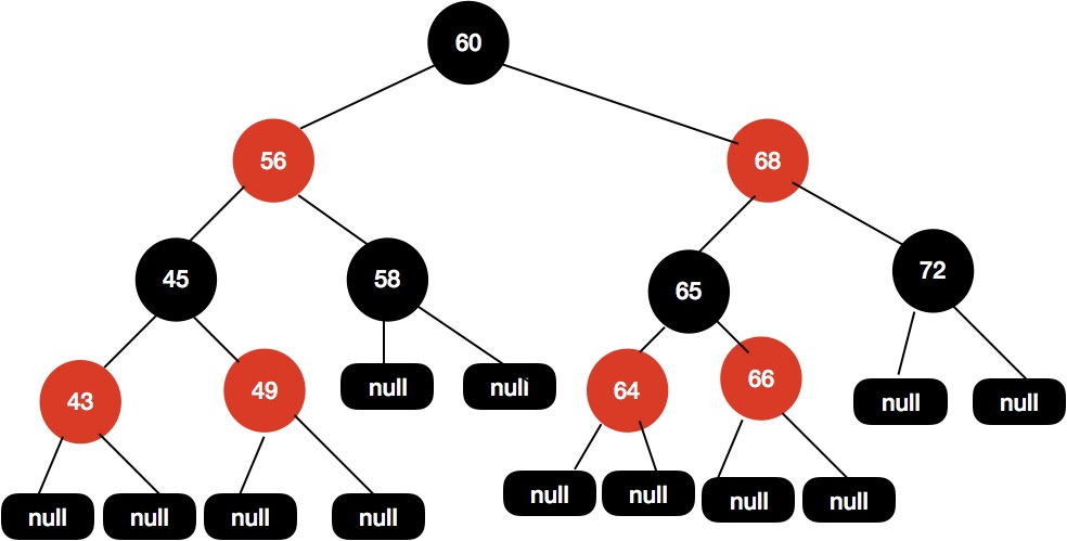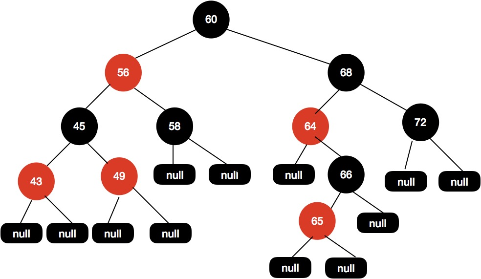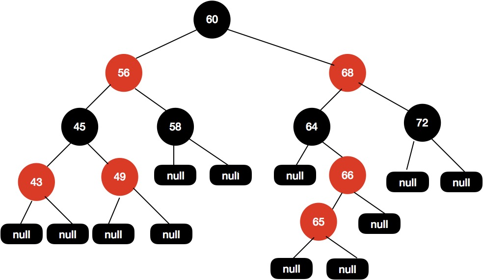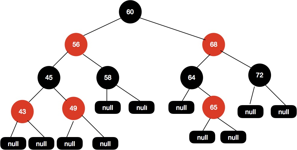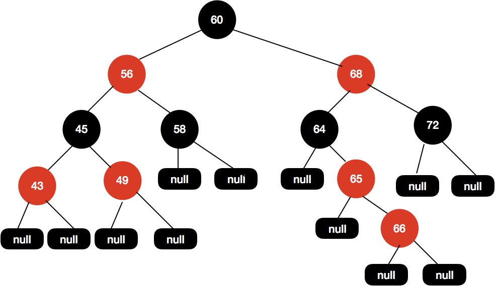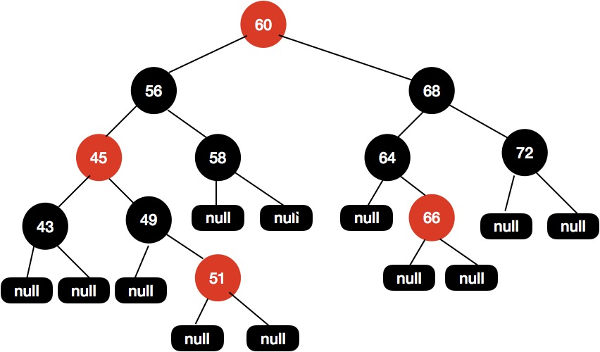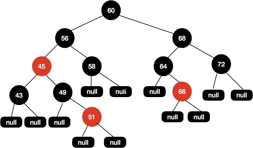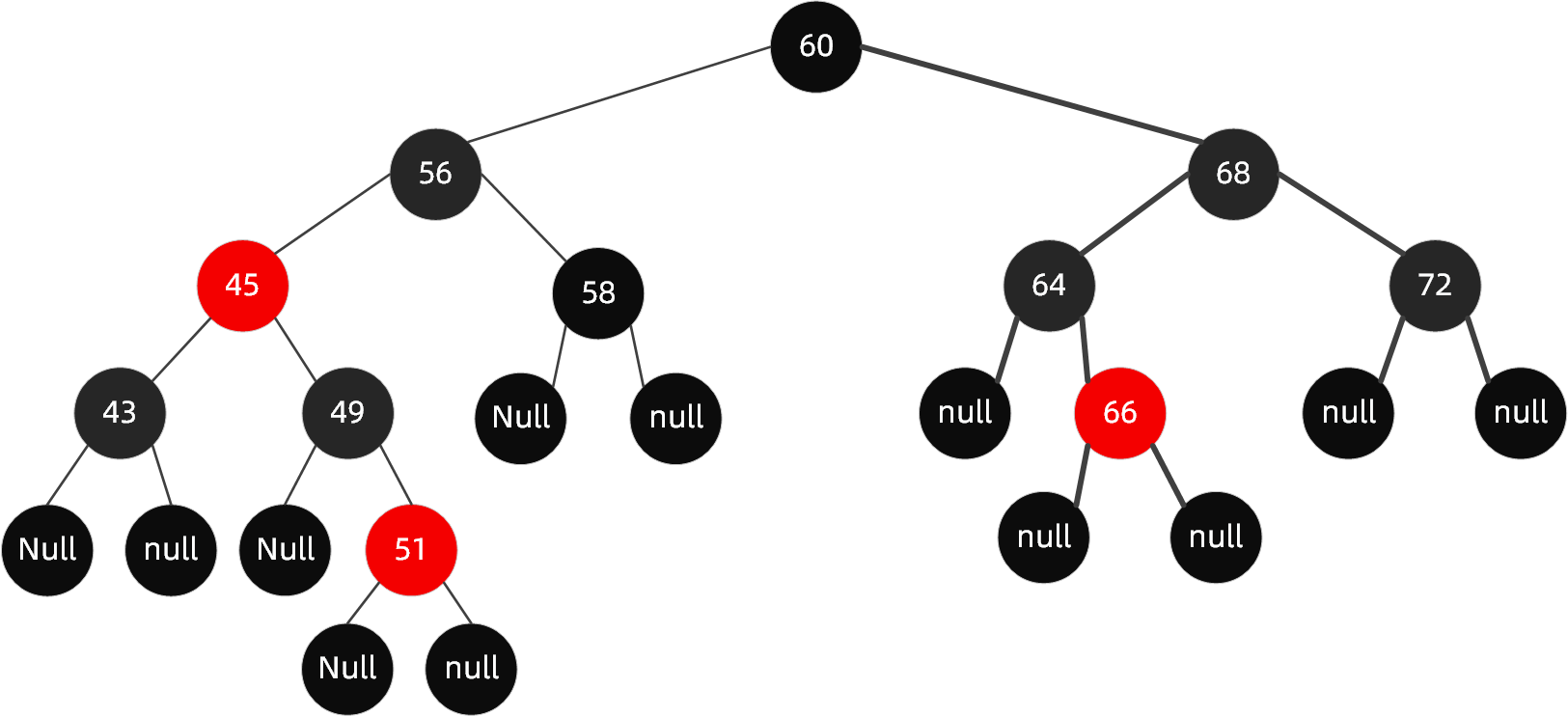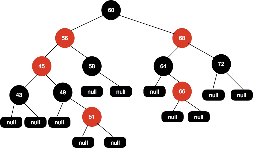 这个时候我们发现黑高是不对的,其中 60-56-45-49-51-null 这条路径有 4 个黑节点,其他路径的黑色节点是 3 个。