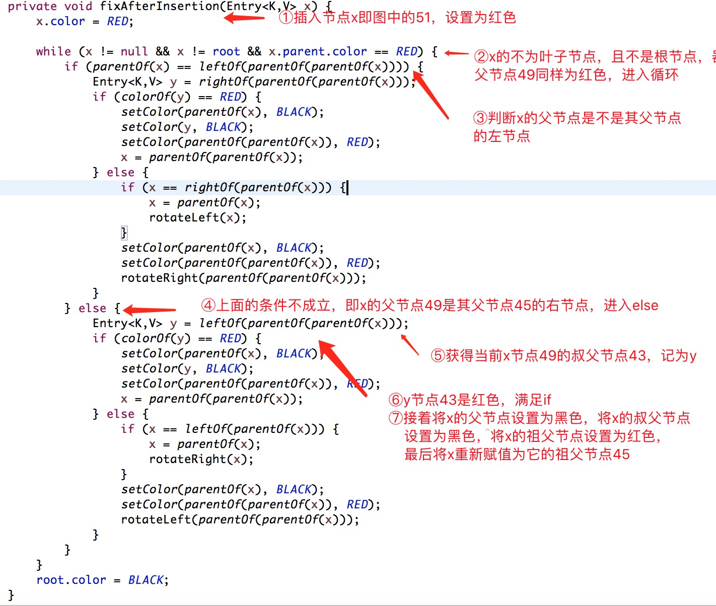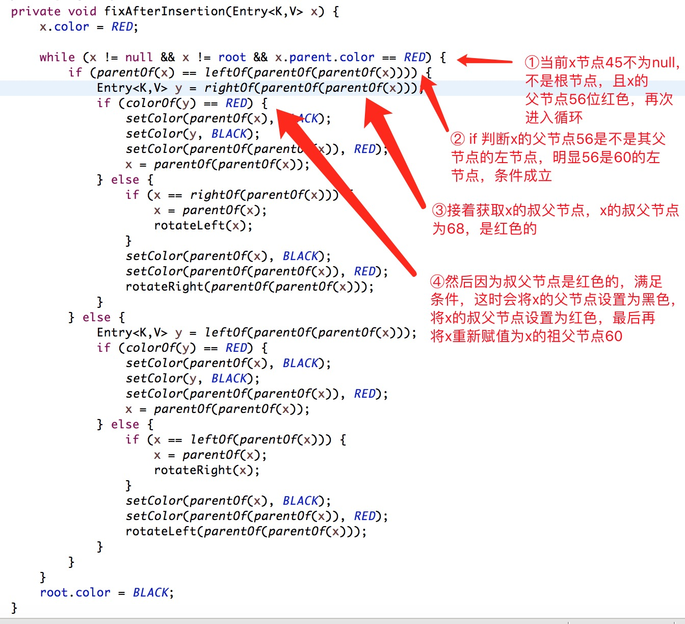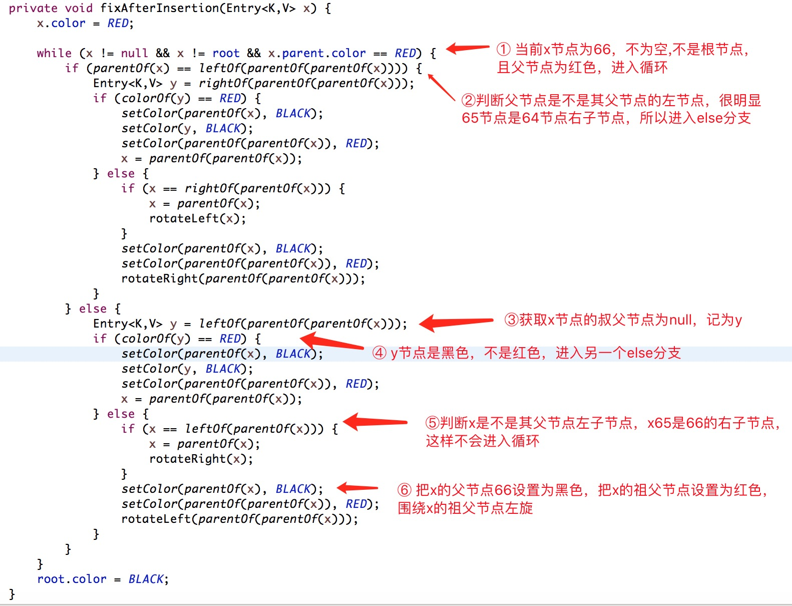 接着调用fixAfterInsertion(e)方法,如下代码流程所示。