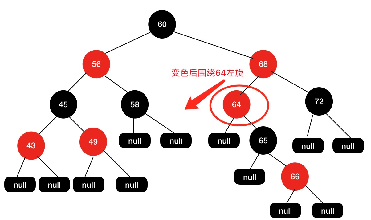 这样操作之后黑高又出现不一致的情况了,60-68-64-null 有 3 个黑色节点,而60-68-64-66-null 这条路径有 4 个黑色节点,这样的结构是不平衡的。
