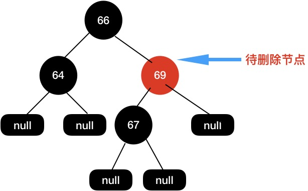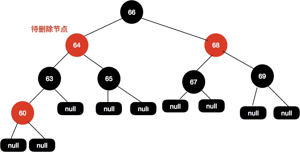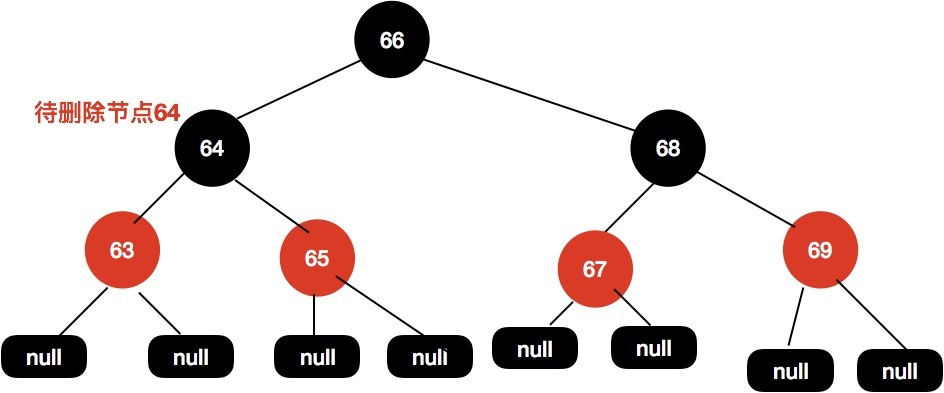 给定下面这颗红黑树,我们需要删除节点64的时候。