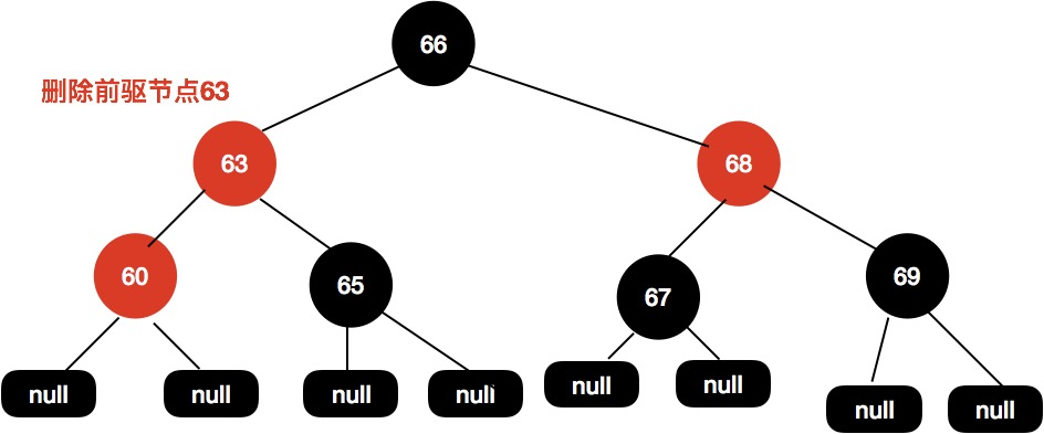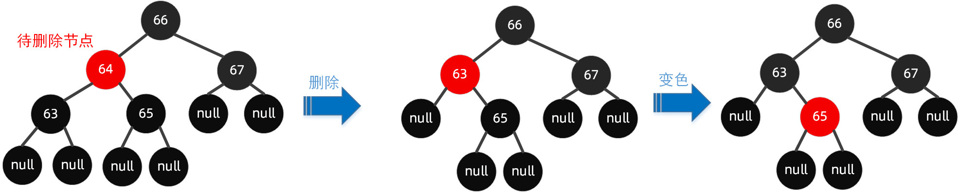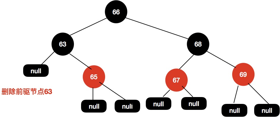 因为要删除节点64,接着找到前驱节点63,把63节点复制到当前位置,然后将前驱节点63删除掉,变色后出现黑高不一致的情况下,最后把63节点设置为黑色,把65节点设置为红色,这样就能保证红黑树的平衡。