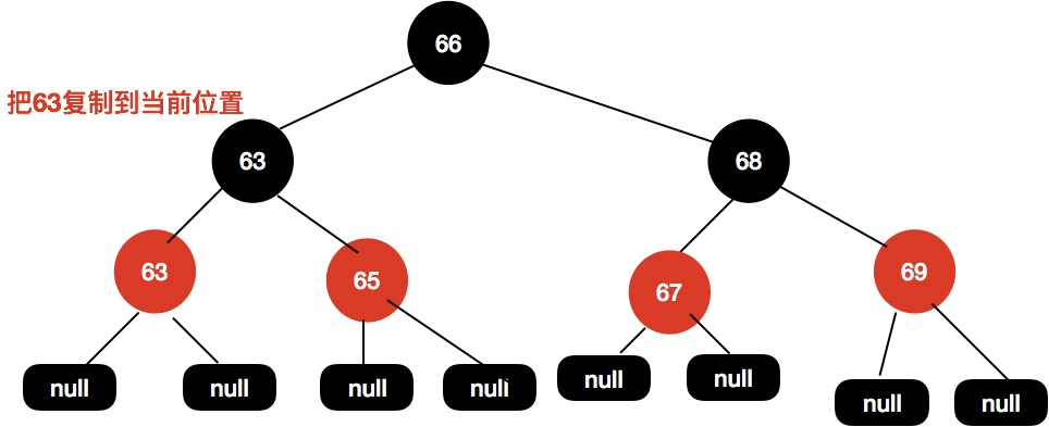 同样地,我们找到64的前驱节点63,接着把63赋值到64这个位置。
