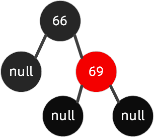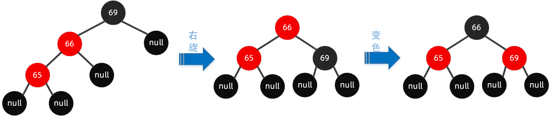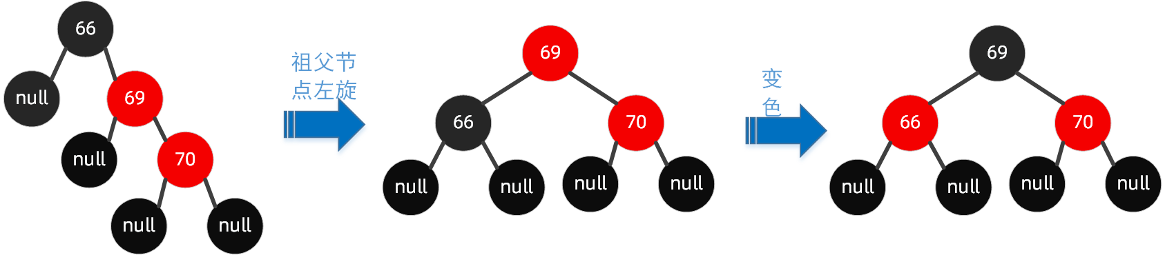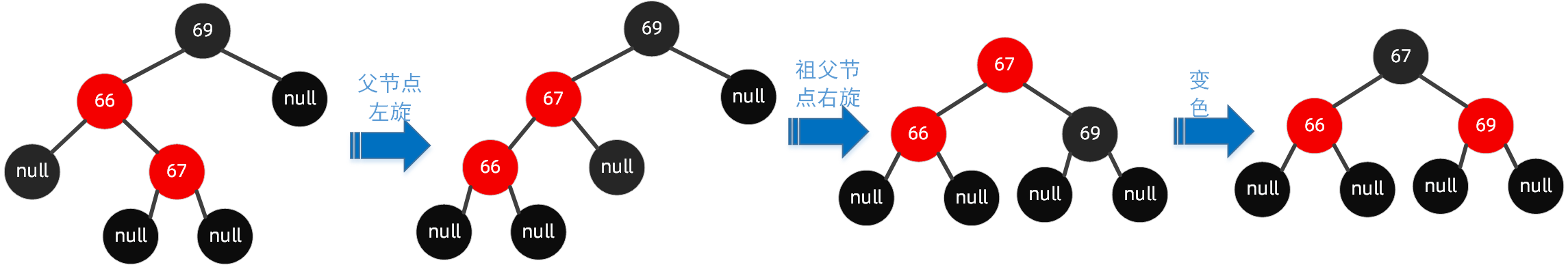 这种情况我们可以这样操作,先围绕父节点 66 左旋,然后再围绕祖父节点 69 右旋,最后再将 67 设置为黑色,把 69 设置为红色,如下图所示。