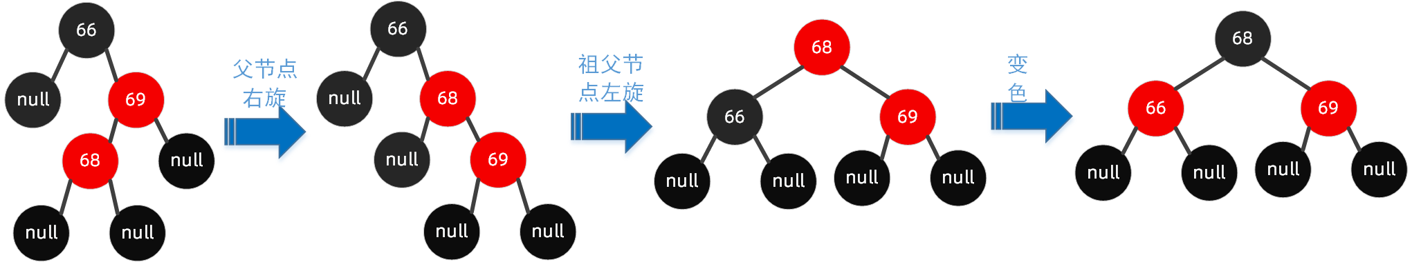 这种情况,我们可以先围绕父节点 69 右旋,接着再围绕祖父节点 66 左旋,最后把 68 节点设置为黑色,把 66 设置为红色,我们的具体操作步骤如下所示。