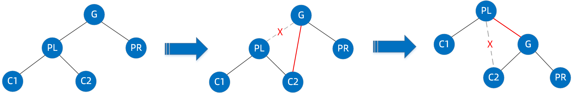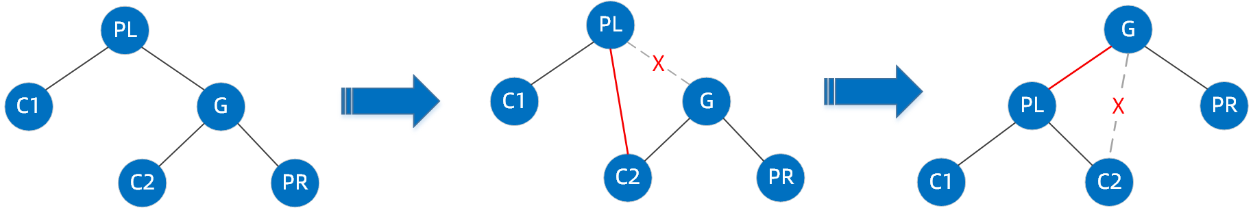 首先断开节点PL与右子节点G的关系,同时将其右子节点的引用指向节点C2;然后断开节点G与左子节点C2的关系,同时将G的左子节点的应用指向节点PL。