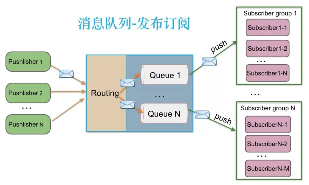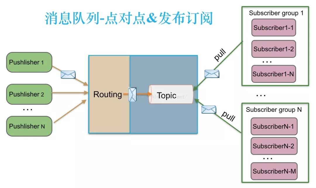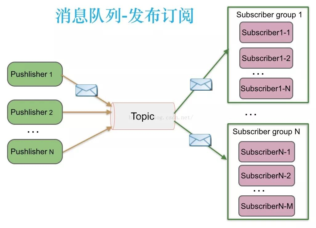 消息生产者(发布)将消息发布到topic中,同时有多个消息消费者(订阅)消费该消息。和点对点方式不同,发布到topic的消息会被所有订阅者消费。支持订阅组的发布订阅模式:发布订阅模式下,当发布者消息量很大时,显然单个订阅者的处理能力是不足的。实际上现实场景中是多个订阅者节点组成一个订阅组负载均衡消费topic消息即分组订阅,这样订阅者很容易实现消费能力线性扩展。可以看成是一个topic下有多个Queue,每个Queue是点对点的方式,Queue之间是发布订阅方式。
