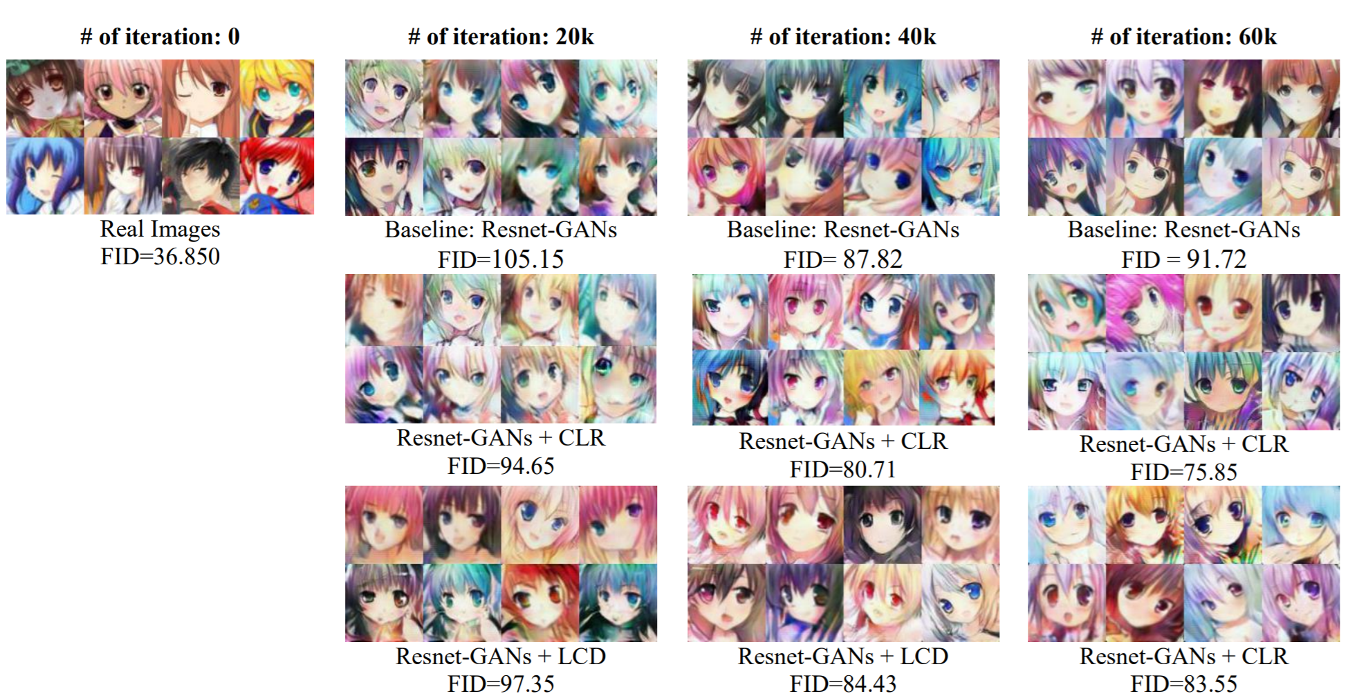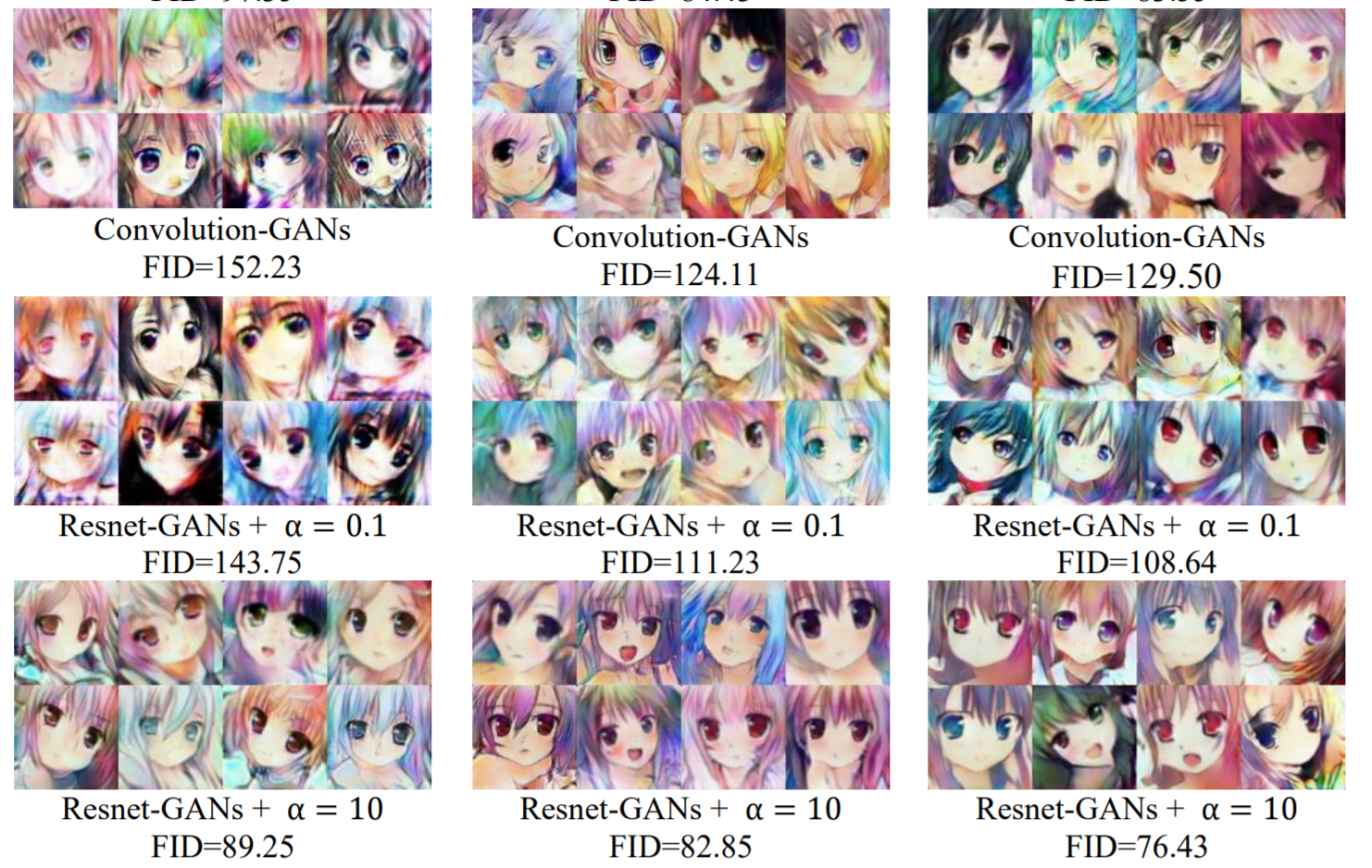 第一行是我用的残差网络生成的结果,第二行我对鉴别器使用循环学习率的结果,第三行是我使用对抗损失递减的结果。首先我的预期是使用循环学习率生成结果更好,FID分数更小,这点是符合我的猜想的,对于对抗损失递减我认为生成的类别更加好一些,举个例子吧眼睛颜色要一致,头发颜色要更加鲜亮,但是实验结果其实效果并不明显,这点其实说明只要对抗损失和类别损失差异不是很大情况下,对生成图像影响不是很大。
