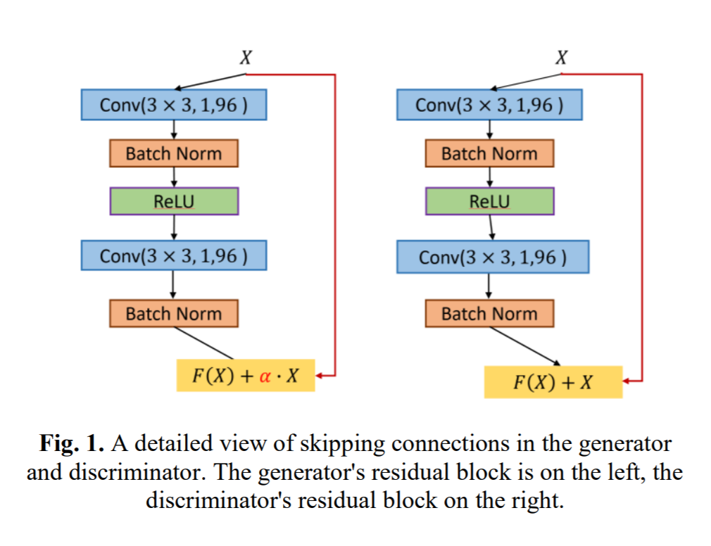 我们论文的第二个实验是探究一下残差网络为什么对图像生成的影响,残差网络首次被提出来是应用图像分类之上,效果是相当不错的,对于残差网络在图像分类上为什么效果好的解释有两个,第一个原论文中的恒等映射,另一个是残差网络相当于一个集成模型,残差网络能选择最优的路径生成图像。虽然没有一篇论文专门的讲如何在GAN中使用残差网络,但是其实已经有很多GAN的论文用到残差网络了,具体可以看一下SAGAN, SR-GAN这两篇论文,但是本文中我们对生成器中的残差块做了一点改动如下所示。