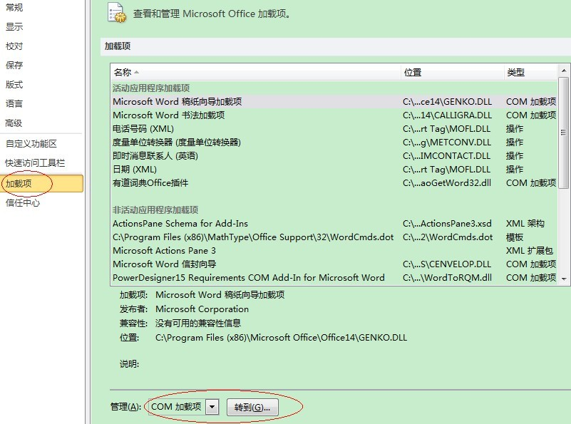 1 打开word文件,文件——选项——加载项中,找到管理“com加载项”点击后面的转到,找到“PowerDesigner”相关的那个项,将前面的勾去掉,单击“确定”按钮。重启Word2010,即可。见下图: