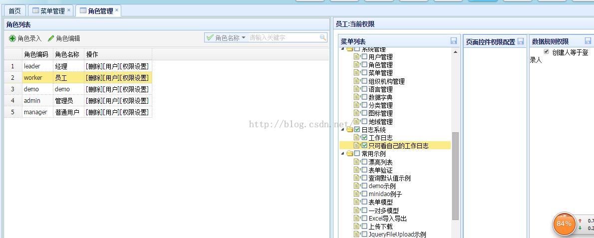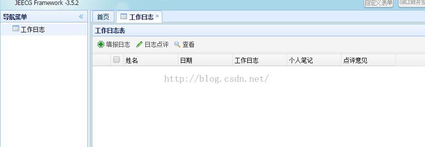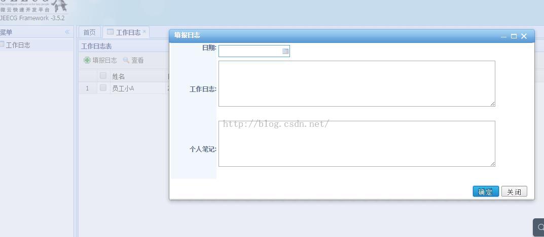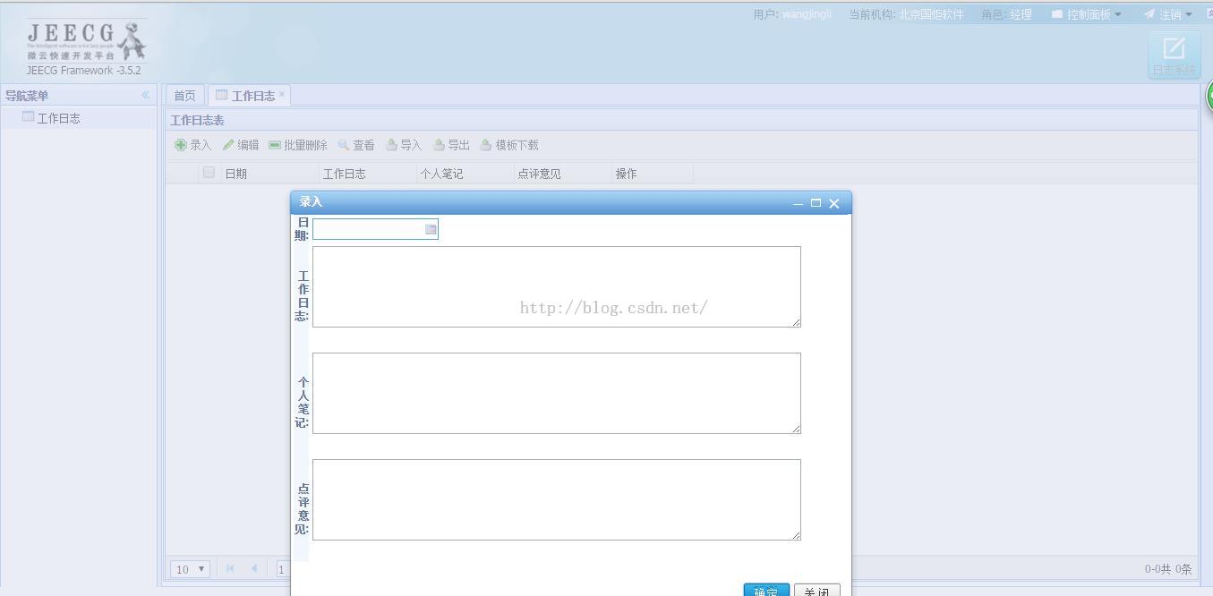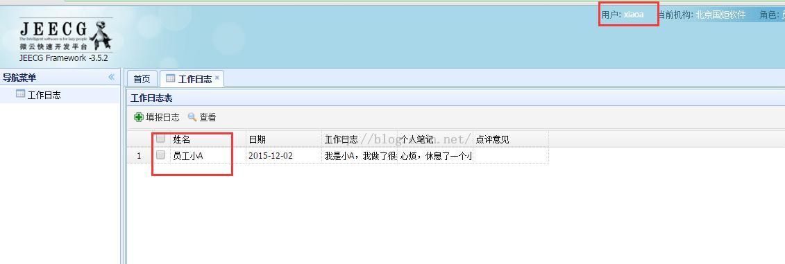 使用王经理登录,测试可以看到工作日志菜单了。但要求的权限还没有进行控制。而且生成的页面样式有点问题。