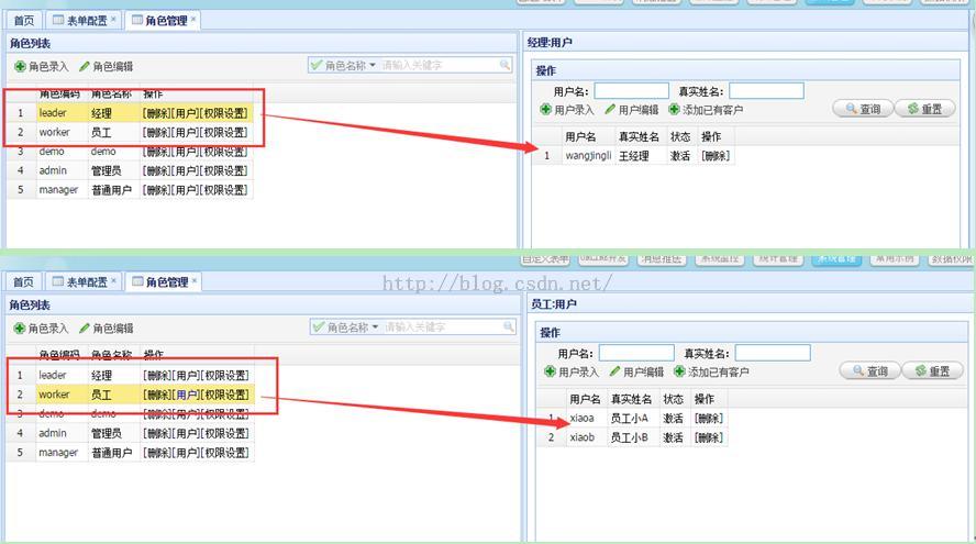 7、 新建两个角色:员工、经理;新建三个用户:员工小A,员工小B,王经理。并分配对应的角色。