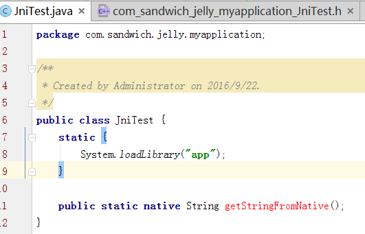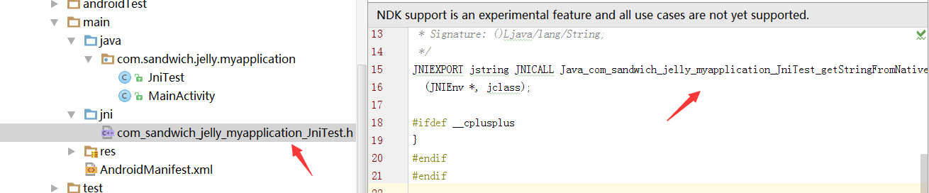 顺利情况下,在路径:*app/src/main/*下会生成一个文件夹jni,文件夹下生成一个文件com_sandwich_jelly_myapplication_JniTest.h,该文件会有一个未实现的方法,方法名称为JNICALL Java_com_sandwich_jelly_myapplication_JniTest_getStringFromNative,该方法对应的就是JniTest.java类对应的getStringFromNative方法。