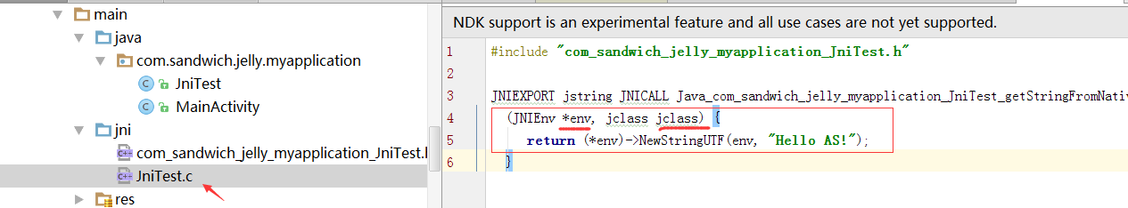 - 编辑JniTest.c,导入头文件com_sandwich_jelly_myapplication_JniTest.h