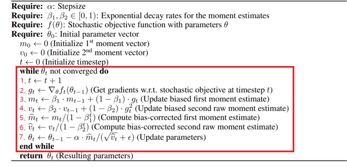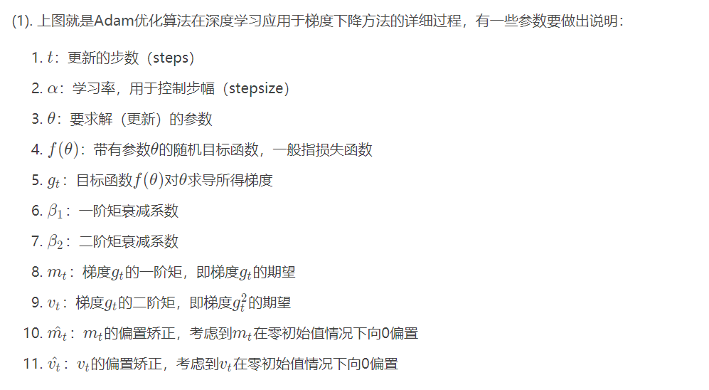 上图就是Adam算法在深度学习中更新参数时应用的详细过程,下面对一些参数进行一下说明: