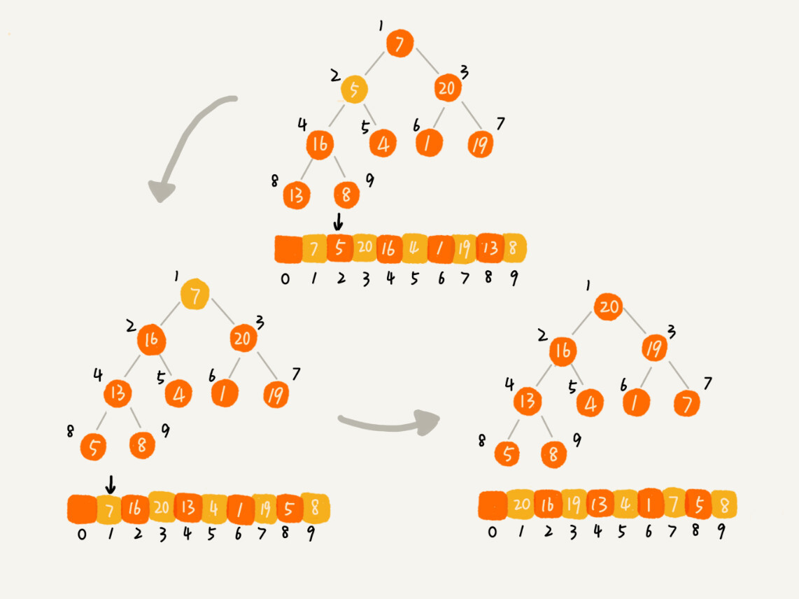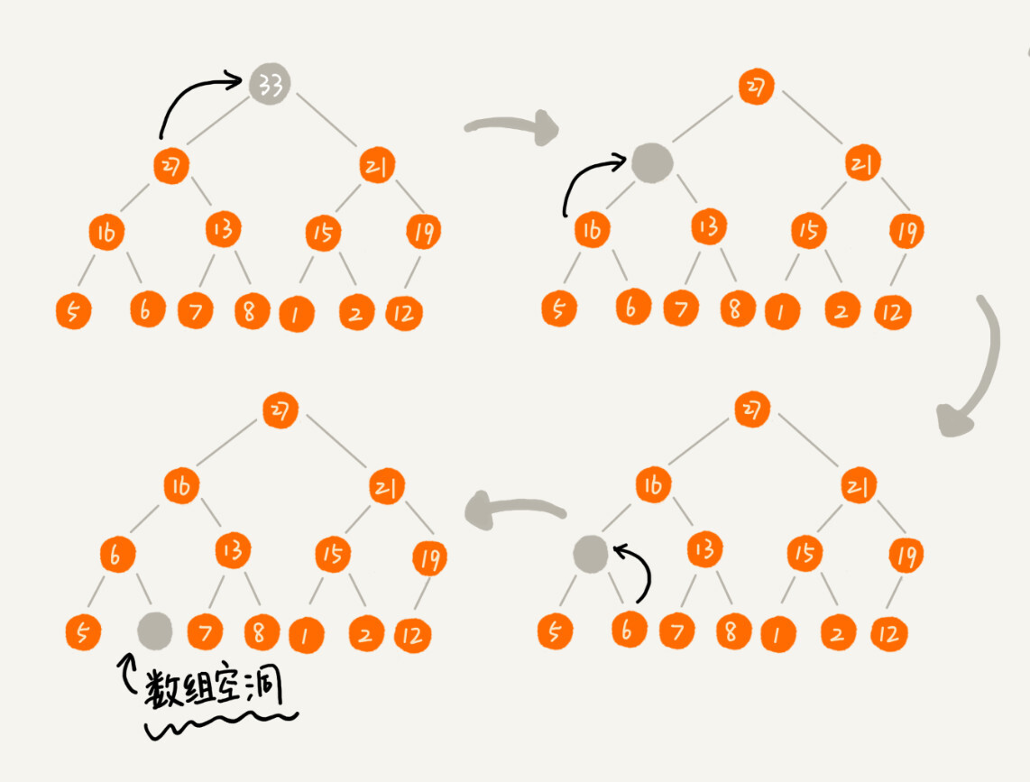 因为我们移除的是数组中的最后一个元素,而在堆化的过程中,都是交换操作,不会出现数组中的“空洞”,所以这种方法堆化之后的结果,肯定满足完全二叉树的特性。
