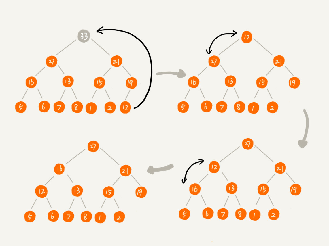 实际上,我们稍微改变一下思路,就可以解决这个问题。你看我画的下面这幅图。我们把最后一个节点放到堆顶,然后利用同样的父子节点对比方法。对于不满足父子节点大小关系的,互换两个节点,并且重复进行这个过程,直到父子节点之间满足大小关系为止。这就是从上往下的堆化方法。