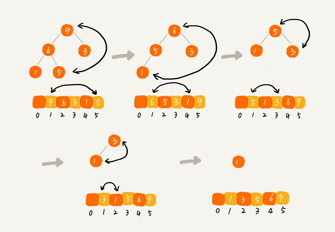 这个过程有点类似上面讲的“删除堆顶元素”的操作,当堆顶元素移除之后,我们把下标为 n 的元素放到堆顶,然后再通过堆化的方法,将剩下的 n−1 个元素重新构建成堆。堆化完成之后,我们再取堆顶的元素,放到下标是 n−1 的位置,一直重复这个过程,直到最后堆中只剩下标为 1 的一个元素,排序工作就完成了。