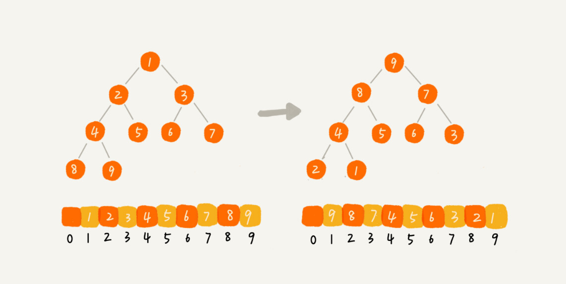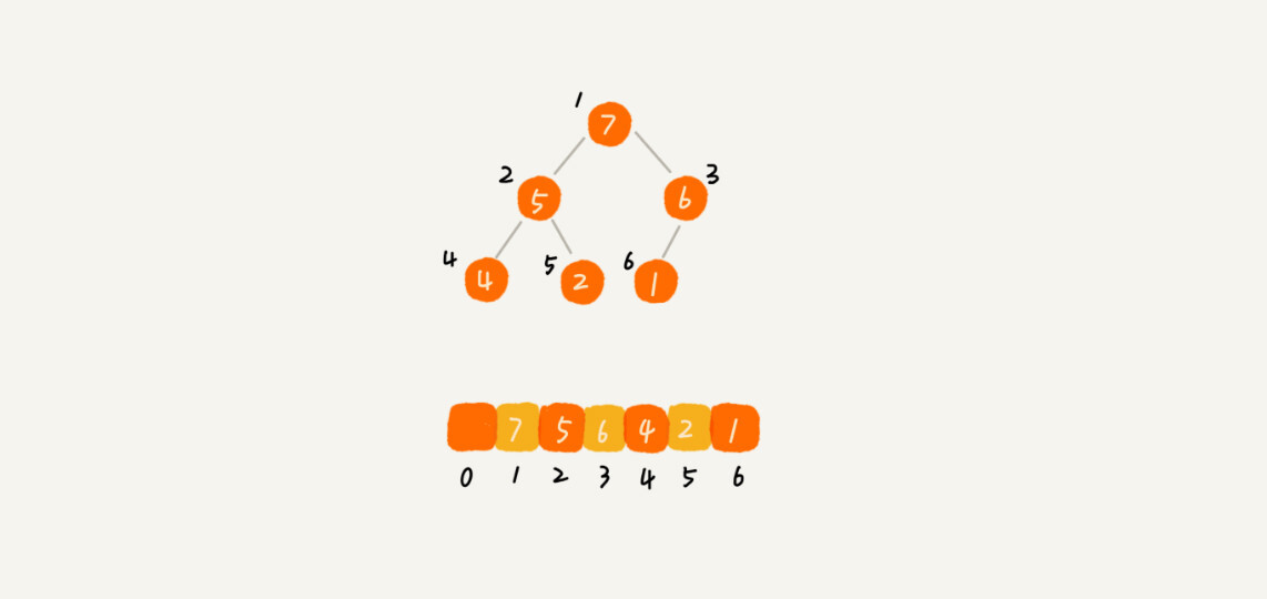 我之前讲过,完全二叉树比较适合用数组来存储。用数组来存储完全二叉树是非常节省存储空间的。因为我们不需要存储左右子节点的指针,单纯地通过数组的下标,就可以找到一个节点的左右子节点和父节点。
